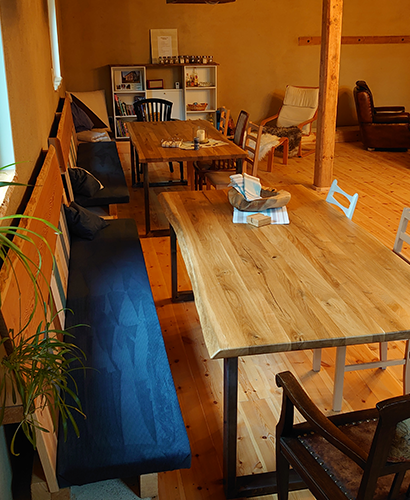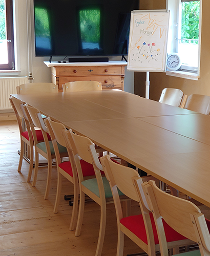 Na dann kommt zu uns! In unserem Seminarraum mit großem Bildschirm, Flipchart und Pinwänden, sowie W-Lan für bis zu 16 Personen könnt Ihr Euch zurückziehen, gemeinsam kreativ arbeiten, Euch coachen lassen, Yoga machen, meditieren, neue Konzepte ausarbeiten und bis spät in die Nacht diskutieren – alles ist möglich! Der helle Raum hat 41 m² und Dielenfußboden. Es stehen Euch bis zu acht Zweiertische und 16 Seminarstühle zur Verfügung. Auch unser großer Wohn-/Essraum oder bei schönem Wetter Hof und Garten können für Eure Zusammenkunft genutzt werden – Ihr seid hier unter Euch!
