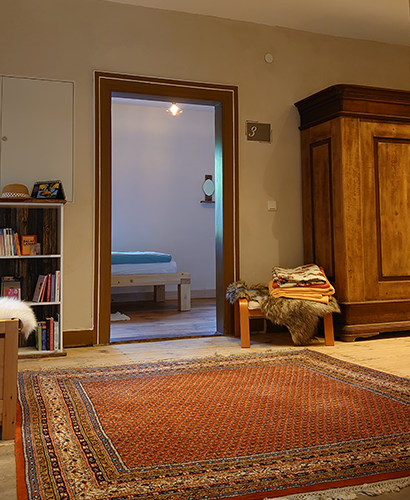 In der Hitzmühle könnt Ihr gemütlich beisammensein. Wir können in den fünf Gästezimmern insgesamt bis zu 15 Gäste unterbringen. Der Wohn-/Essraum steht Euch immer zur Verfügung.